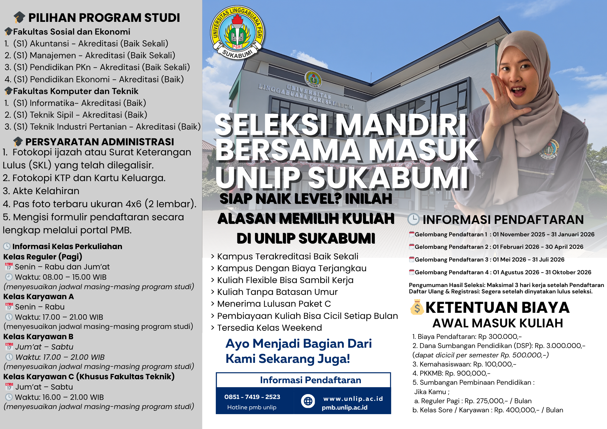 Universitas Linggabuana PGRI Sukabumi (UNLIP) kampus dengan semangat “Berkarya, Berprestasi, dan Berdampak!”. UNLIP hadir sebagai pilihan tepat bagi generasi muda yang ingin mengembangkan potensi akademik dan profesional dengan lingkungan belajar yang inspiratif, dosen berpengalaman, serta fasilitas pendidikan yang terus berkembang. Bersama UNLIP, saatnya wujudkan masa depan cerah dan berkontribusi nyata bagi masyarakat!
