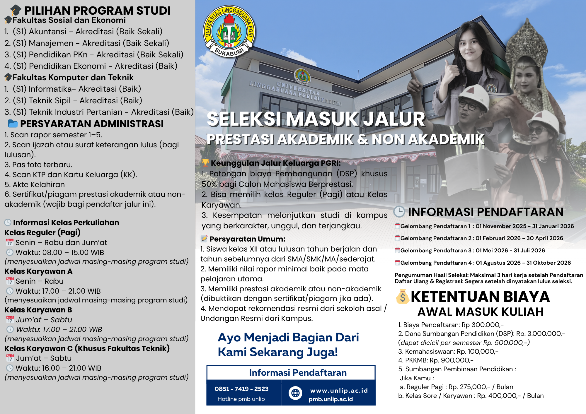 Universitas Linggabuana PGRI Sukabumi (UNLIP) kampus dengan semangat “Berkarya, Berprestasi, dan Berdampak!”. UNLIP hadir sebagai pilihan tepat bagi generasi muda yang ingin mengembangkan potensi akademik dan profesional dengan lingkungan belajar yang inspiratif, dosen berpengalaman, serta fasilitas pendidikan yang terus berkembang. Bersama UNLIP, saatnya wujudkan masa depan cerah dan berkontribusi nyata bagi masyarakat!